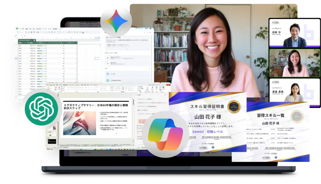 ChatGPTの基本操作から、プロンプト設計、メール・資料・アイデア出しからZapier・MCPとの連携など実務応用まで体系的に学ぶコースです。