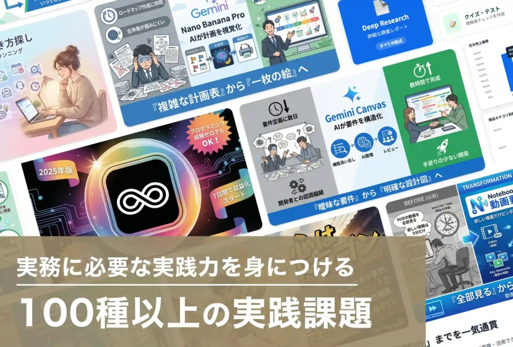 リサーチ、要約、レポート作成など“調べて・まとめる”作業を効率化するするスキルやGoogle関連のツールとAIを連携してエージェントを作成する応用スキルも習得します。