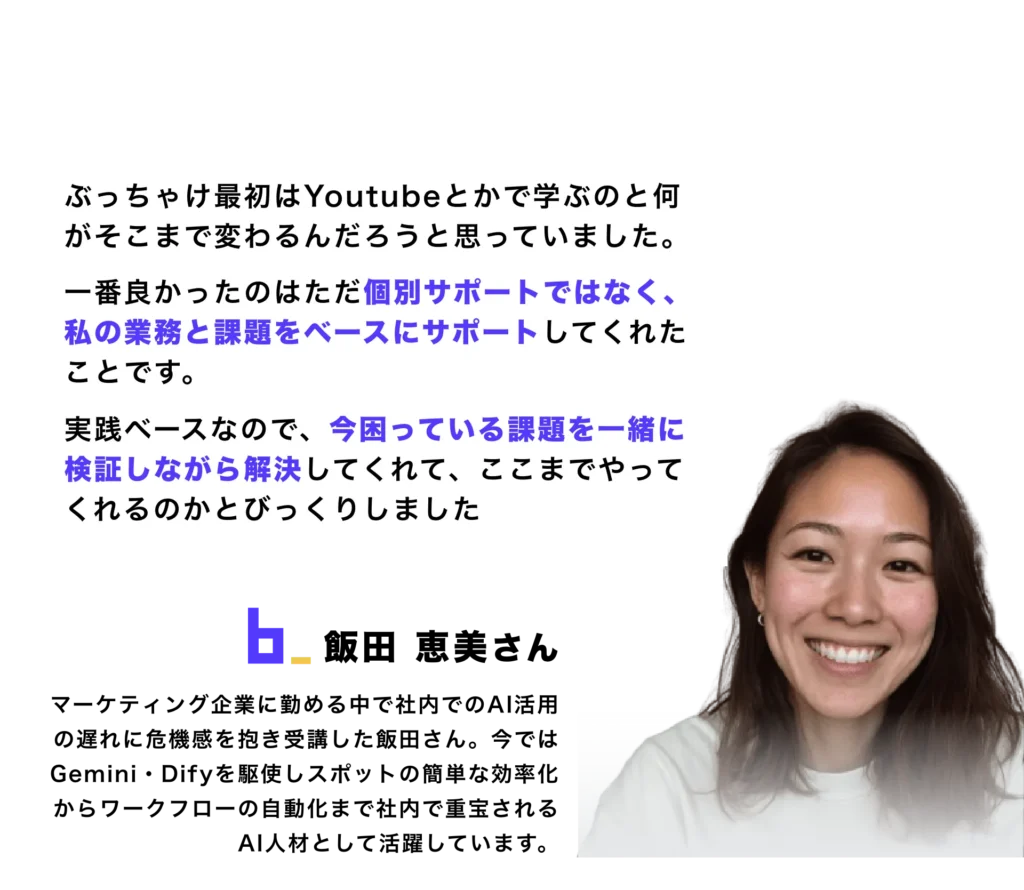 このコースでは、生成AIの基礎から始め、ChatGPTなどのツールを使いこなすためのプロンプトエンジニアリングの技術を短期集中で学びます。未経験者でも、数週間でAIを効果的に活用する方法をマスターすることができます。